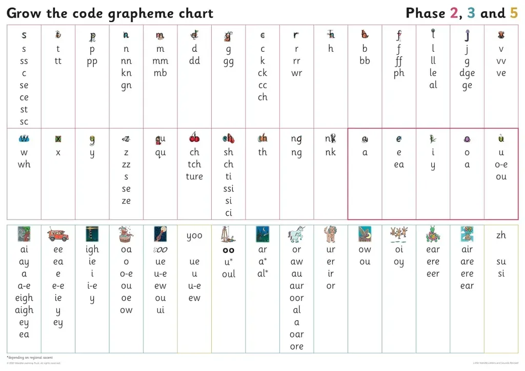 Phonics is the name given to the process of learning the sounds, names and shapes of the letters that make up the English language. There are 44 different sounds, made up of singular or groups of letters. Some of these sounds then have a variety of ways of writing them down.